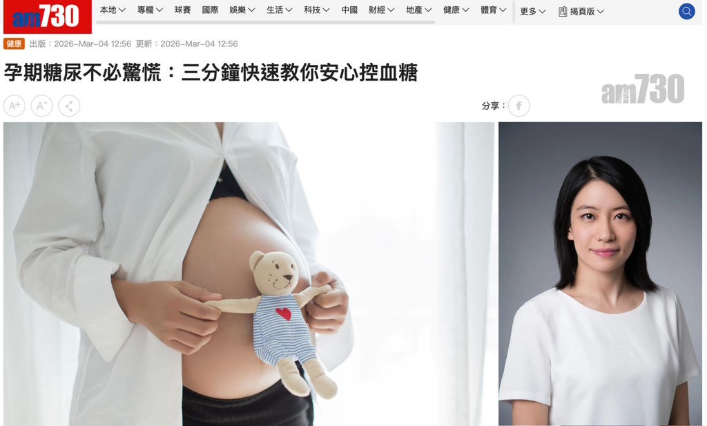 《Am730》專訪婦產科專科 張凱晴醫生,講解妊娠糖尿的成因、風險及血糖管理重點,提醒準媽媽透過早期篩查與健康生活方式,安心迎接寶寶的誕生。